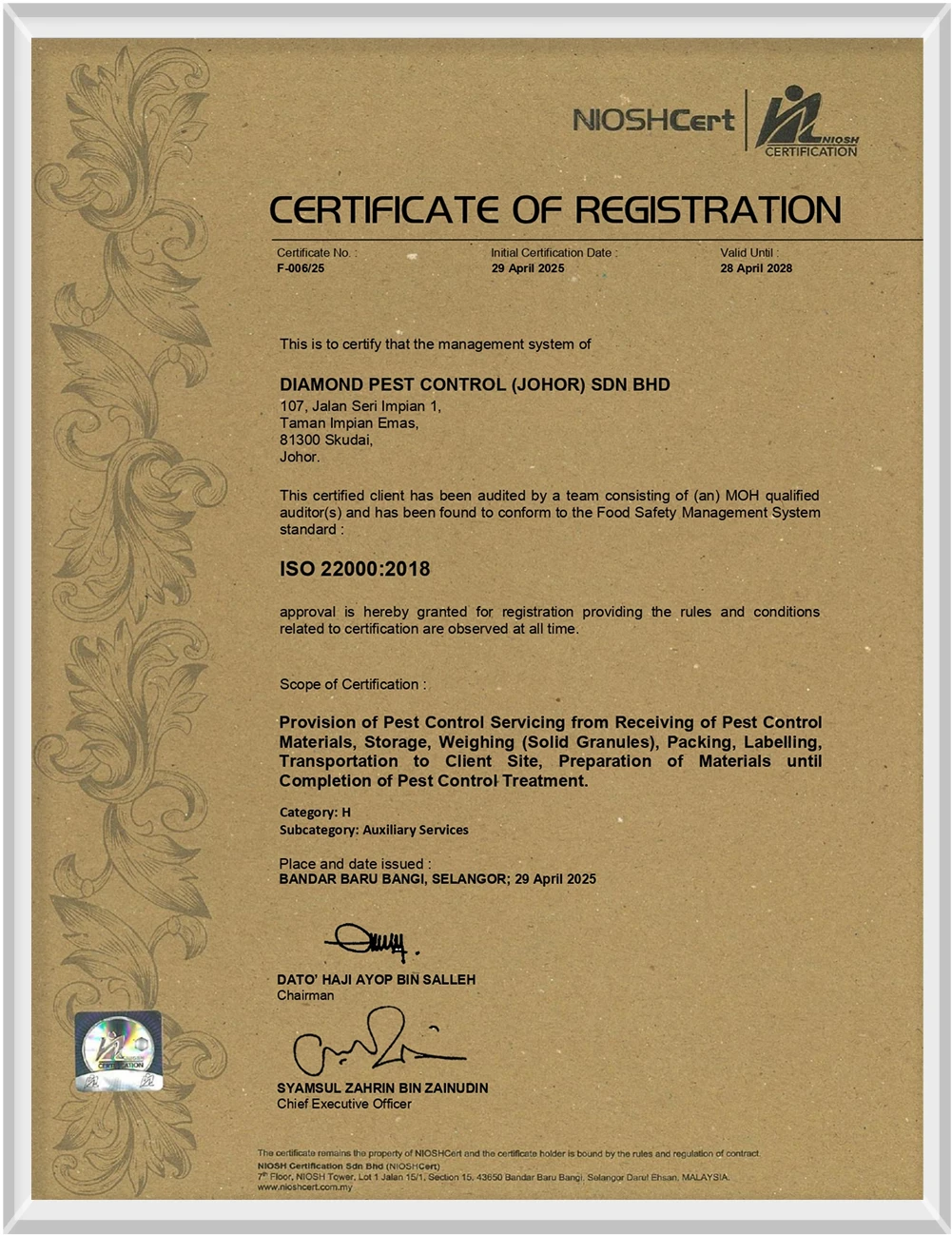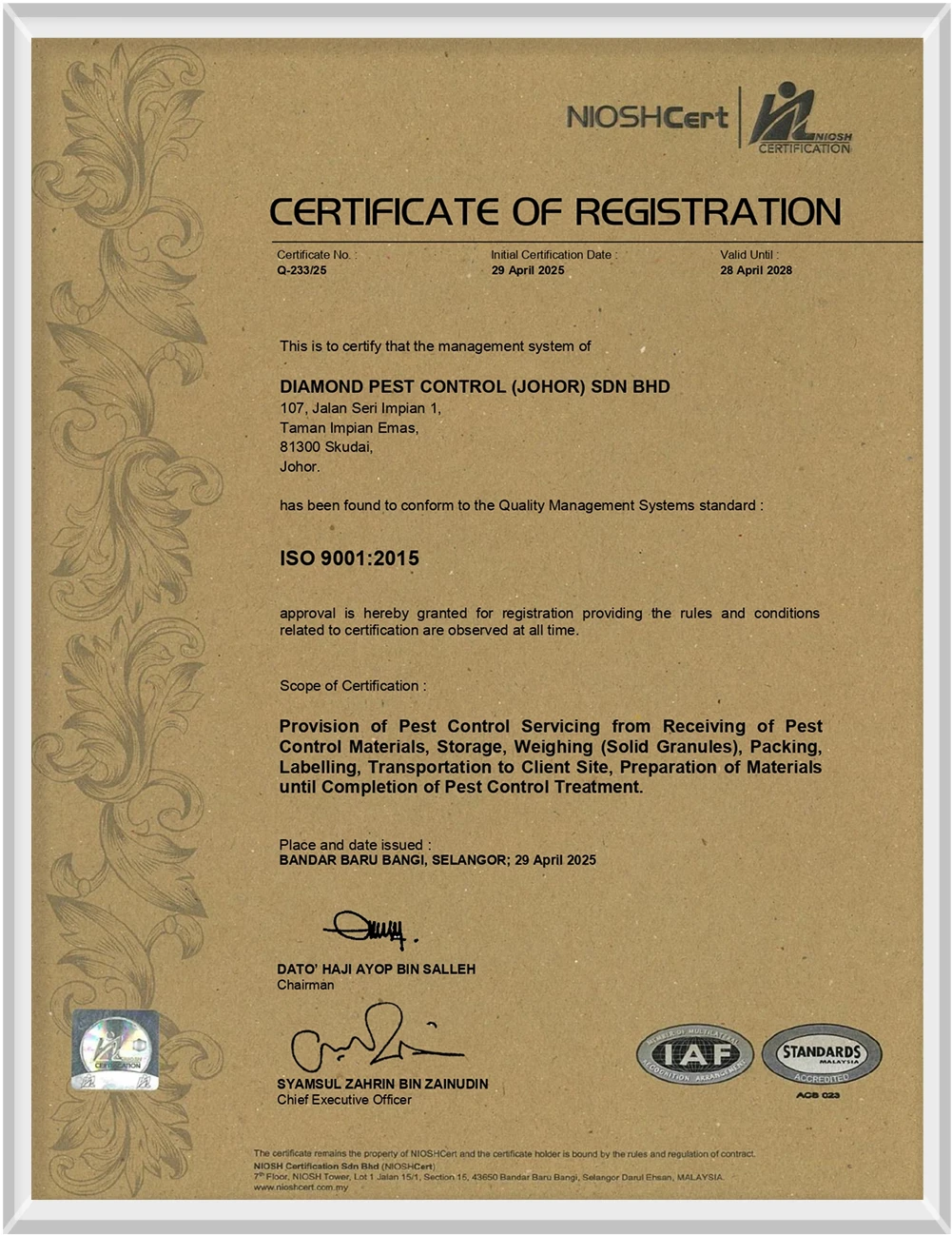 We are proud to announce that Diamond Pest Control has achieved a groundbreaking milestone as the first pest control company in Malaysia to receive the prestigious