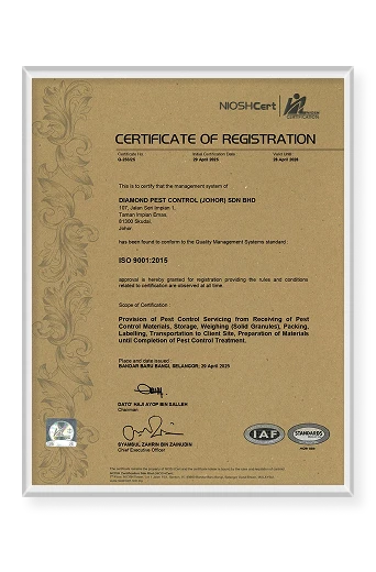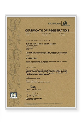 引领害虫防治行业的卓越标准。我们很荣幸宣布,Diamond Pest Control 已成功获得ISO 22000认证,同时也荣获ISO 9001认证,成为马来西亚害虫防治行业首家取得ISO 22000认证的公司。